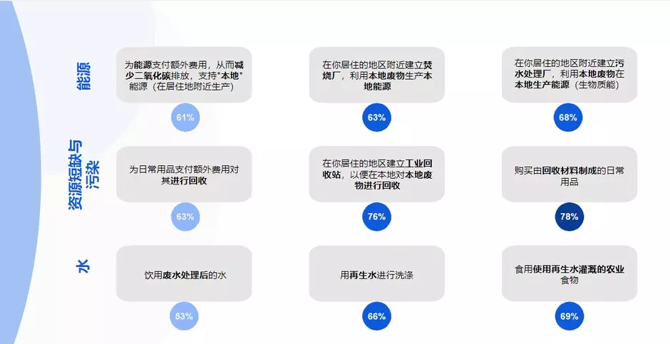 在民意指标所涵盖的诸多主题中,受访者对经过验定的绿色解决方案正在形成明确共识,人们对实施此类解决方案所需的变化(包括与能源、资源保护、水有关的举措)也有着颇高的接受度。