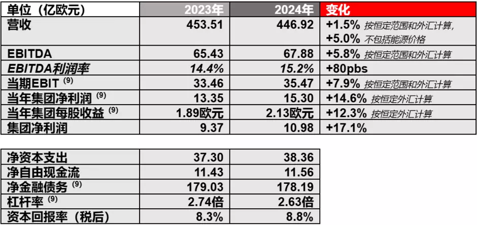 净自由现金流强劲,达到11.56亿欧元,净金融债务(5)正常可控,为178.19亿欧元,杠杆率(5)在2024年底为2.63倍。