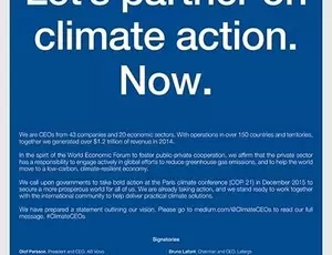 活跃在20个不同行业,业务遍及全球150个国家,2014年总收入逾12万亿美元的43家国际领先集团CEO正在联合行动,为2015年12月巴黎第二十一届联合国气候变化大会(COP21)上一项应对环境变化的全球化负责任的协议做准备。